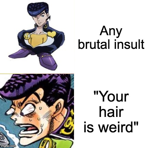 If you discover this site serviceableness, please support us by sharing this posts to your preference social media accounts like Facebook, Instagram and so on or you can also Get this blog page with the title Jojo Josuke Hair Meme by using Ctrl + D for devices a laptop with a Windows operating system or Command + D for laptops with an Apple operating system. If you use a smartphone, you can also use the drawer menu of the browser you are using. Whether it's a Windows, Mac, iOS or Android operating system, you will still be able to bookmark this web.
